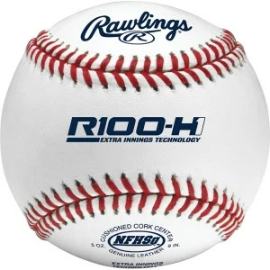 The Rawlings R100-H1 is a quality, Superstitch™ high seam professional ball for high school and adult leagues. It is NFHS stamped for official high school use. It uses Extra Inning Technology (EIT™) for 15% longer life with the same great consistency and moisture protection. The full-grain leather, cushioned cork center, and Core Bond™ adhesive additionally contribute to the ball’s durability and elongated lifespan.