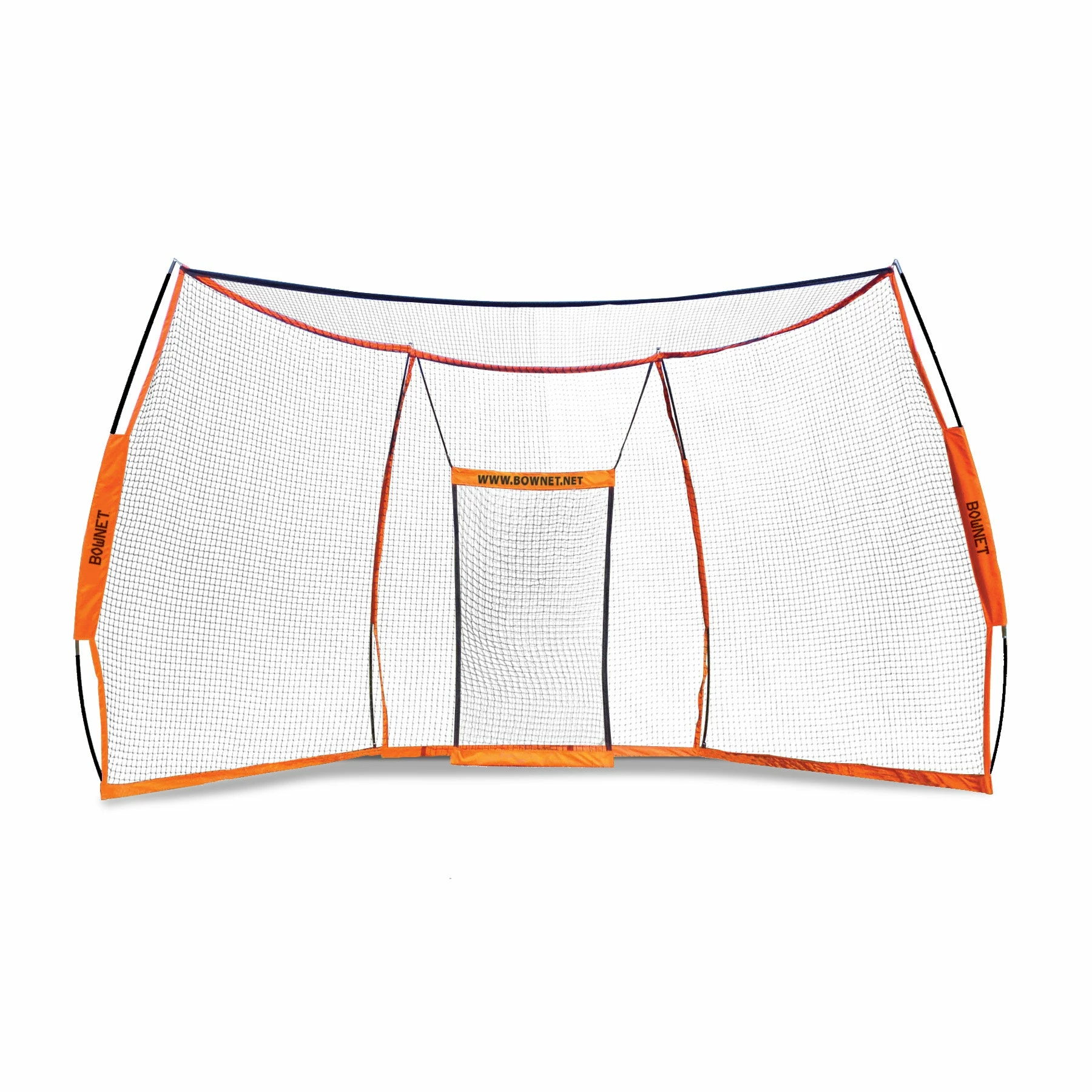 Turn any patch of grass into a baseball field with the Portable Multi-Sport Backstop. Coaches and players worldwide prefer this 17.6′ wide x 9.6′ tall backstop to protect their spectators and give outstanding reliability during practice or a game. The backstop has a large overhang to protect from foul balls and can be used as a catcher during soft-toss, tee work, infield practices, and more. Bownet’s EAS™ technology (Energy Absorption System™) helps reduce stress and tension on the netting, extend the lifespan of the net, create a more balanced backstop, and add flexibility and stability upon impact. Powder coated steel frame have non-marking rubber feet to prevent damage to floors and provide stability and traction indoor and outdoor. The Backstop sets up in 3 minutes without pull straps, screws, or tools required and is lightweight making it easily maneuverable across a field or gym. The Bownet Portable Backstop includes a Baffle Net and a Canvas Baffle with a printed strike-zone to turn this backstop into an all-in-one practice net that you can hit or throw into or out of. Collapse the backstop and place into the provided manageable roller case for easy portability and storage. One year limited manufacturer warranty available. PLAY ANYWHERE. – PLAY NOW!®