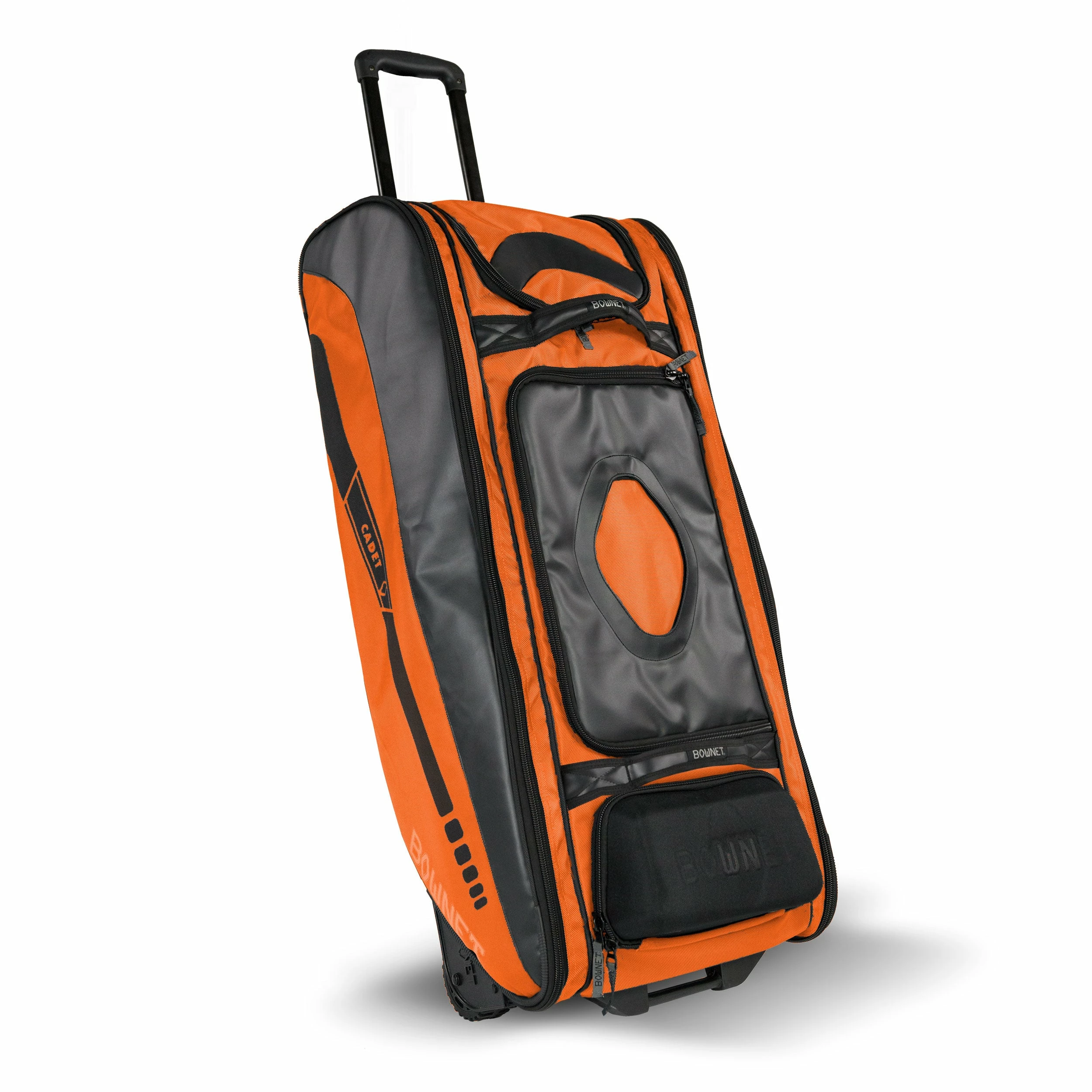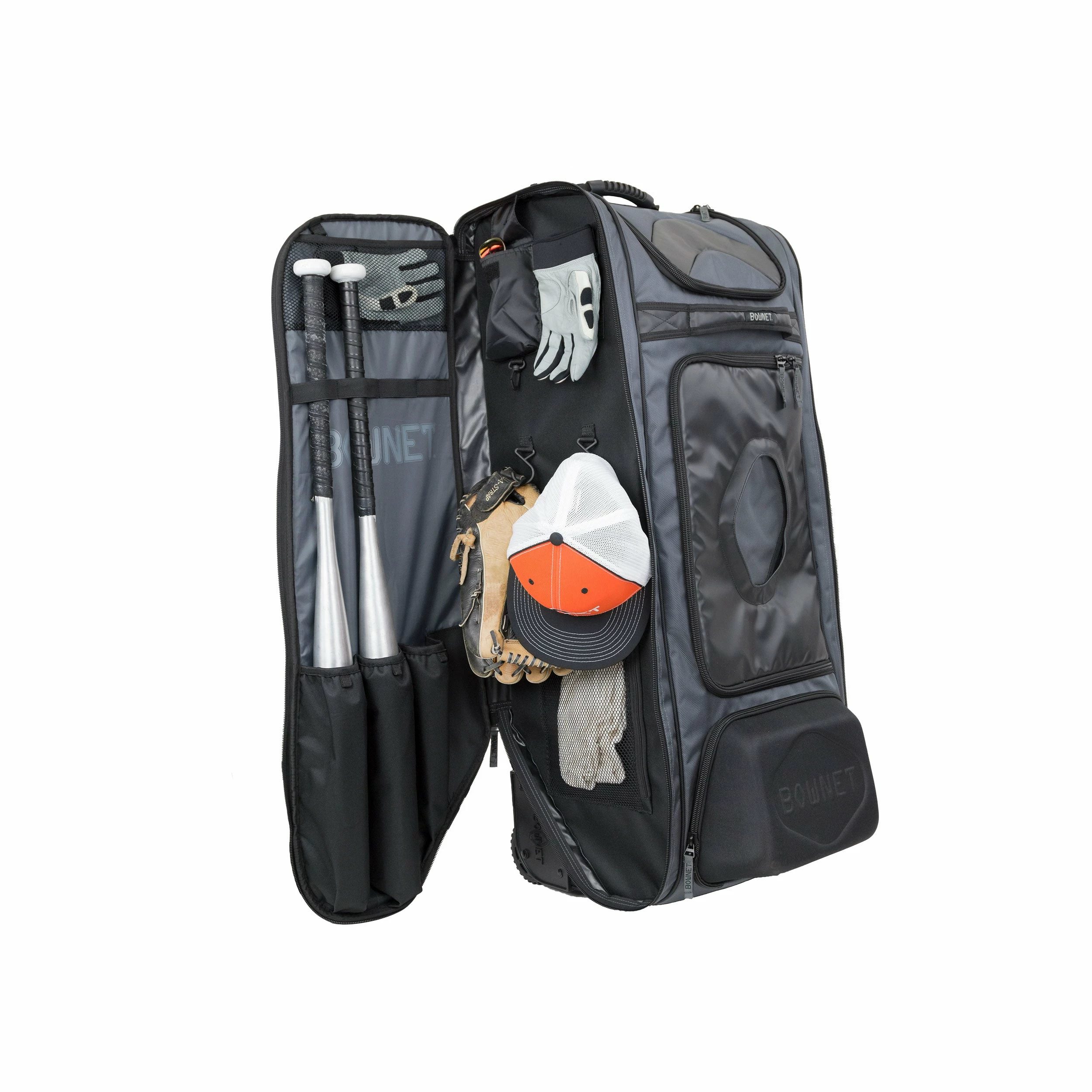 - Multiple accessory pockets, batting glove attachment panel and removable shelving system.