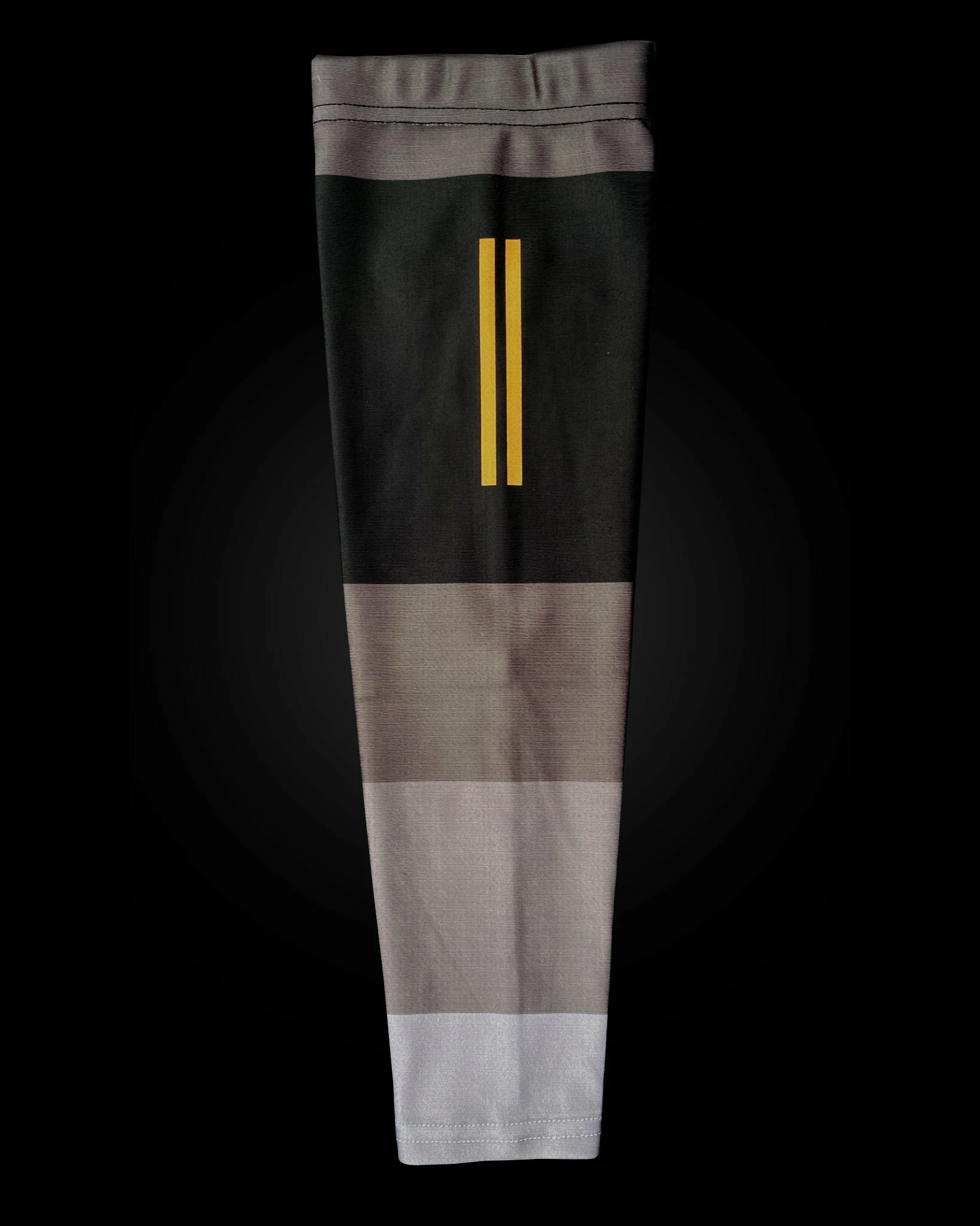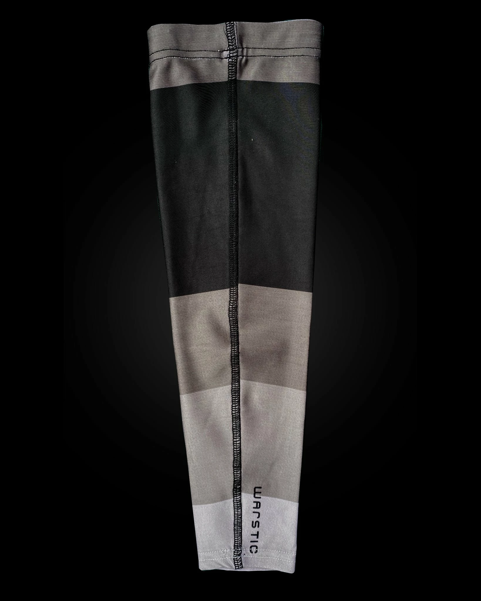 Made of moisture wicking material to keep your arm cool on game day, while keeping your muscles primed and ready between at-bats and plays. Offers SPF 50+ sun protection. Features a gradient blocks of gray and our Warstripe logo in gold in the darkest, middle block on the front, and “Warstic” in white along the seam at the wrist.
