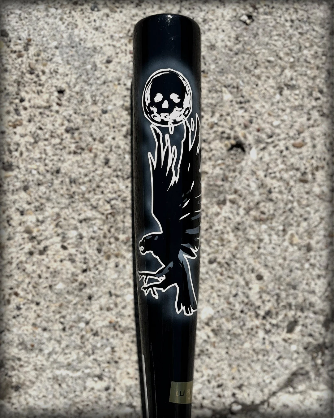 This Small Batch ‘Nightmare on Maple Street’ WSKP11 Wood Bat is wrapped with a clutching bone hand and screaming skull that’s sure to strike fear into anyone it faces. The opposite side features a raven, known to be the connector of the spirit and material world, as it flies passed a full lit moon.