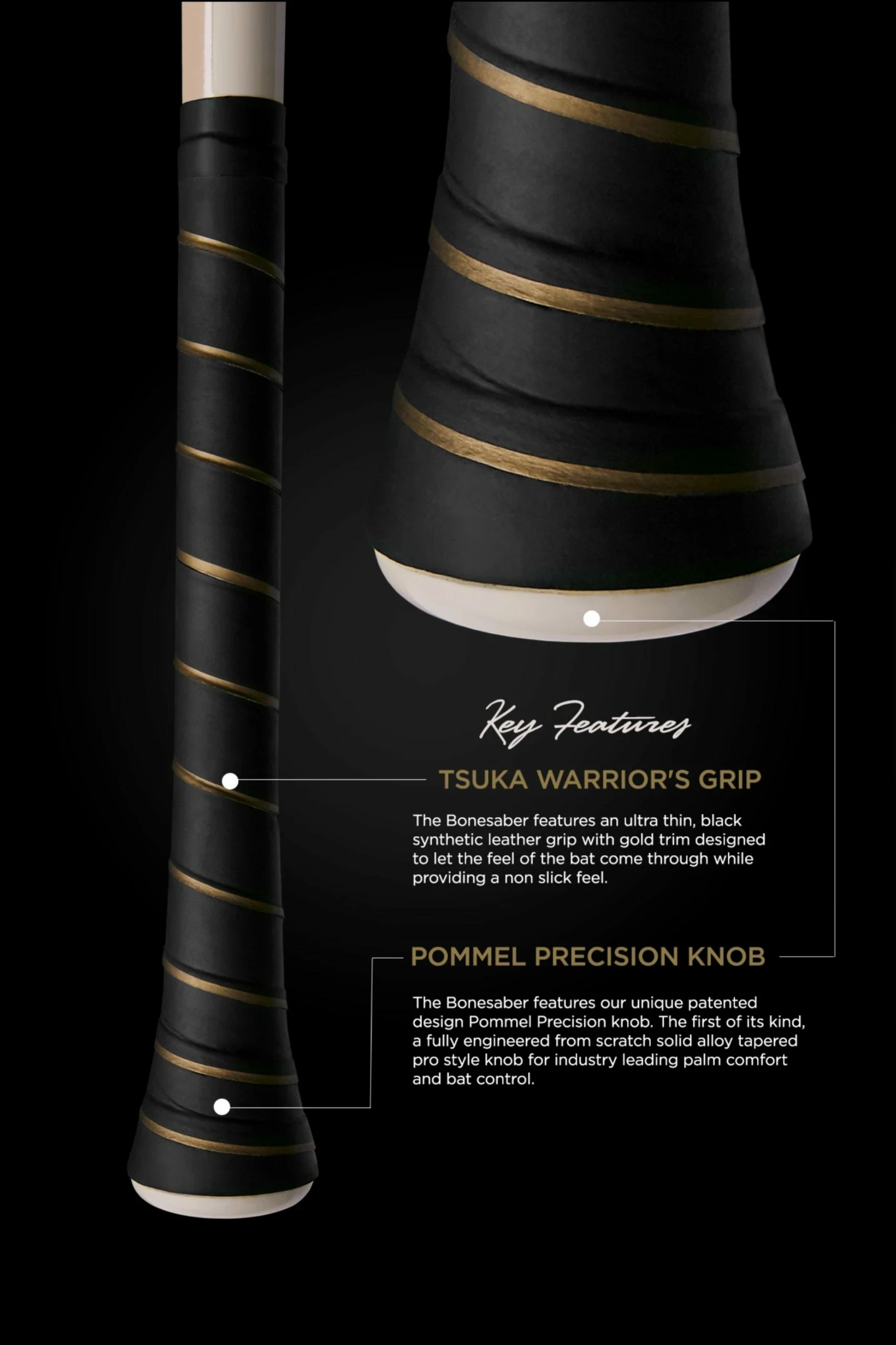 The Tsuka Warrior’s Grip is a signature part of the Warstic Bonesaber Metal Bat. The ultra-thin synthetic leather material provides comfort without masking the feel of the handle and patented Pommel Precision Knob, making it a favorite of #WarstripeNation. This OEM grip is exactly the one found on the Bonesaber, right down to the iconic black & gold design.